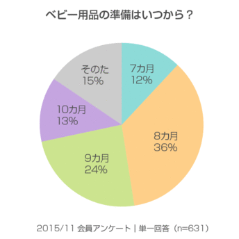 準備を始める時期は人それぞれですが、先輩ママに聞いた「ベビー用品の準備時期」に関するアンケートによると、妊娠8カ月ごろに準備をした人が一番多い結果となりました。