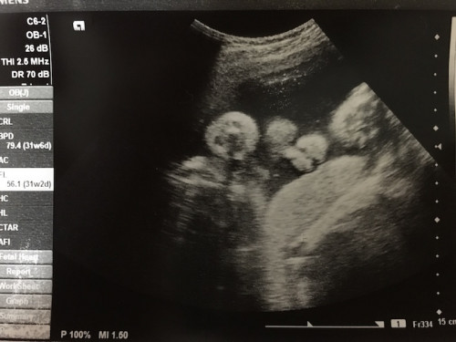 上写真は30週の時のもので、顔がこちらを向いている写真。鼻の形や鼻の穴、口、頬などが確認できます。