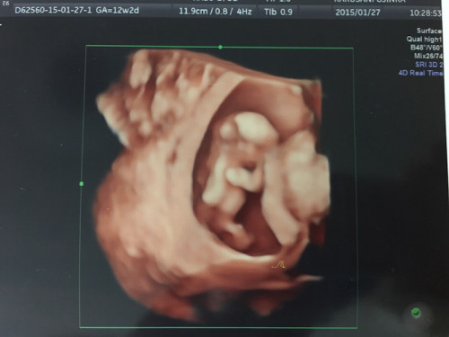 2人目の出産の際に通っていた産院で、最新技術の“HDライブ”でお腹の赤ちゃんを撮影してもらったことがあります(上写真)。3D、4Dよりもさらにリアルに、内視鏡画像のように表現できる画期的な技術だそう。12週の時の様子です。立体的ですよね!